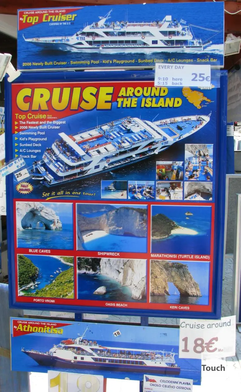 Includes: Dafni, Kalamaki, Laganas, Cameo Island, Marathonisi Island, Keri, Arba hotel, Marathias, Plakaki, Korakonissi, Porto Roxa, Porto Limnionas, Porto Vromi, Navagio (Shipwreck), Potamitis windmill, Agios Nikolaos, Makros Gialos, Xigia Sulfur, Xigia Pelagaki, Alykes, Alykanas, Amboula, Bouka, Tsilivi, Krioneri, Argassi, Porto Kaminia, Porto Zorro, Banana, Agios Nikolaos, Mavratzi, Porto Roma, Gerakas